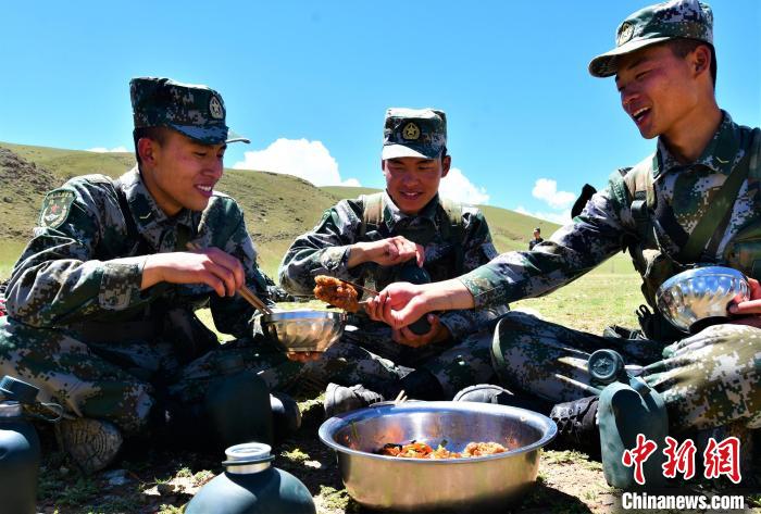 圖為西藏軍區(qū)某合成旅野外拉練官兵野餐現(xiàn)場(chǎng)。萬(wàn)玲 攝