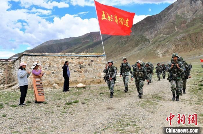 圖為西藏軍區(qū)某合成旅野外拉練途中,民眾向拉練官兵打招呼。念美多杰 攝