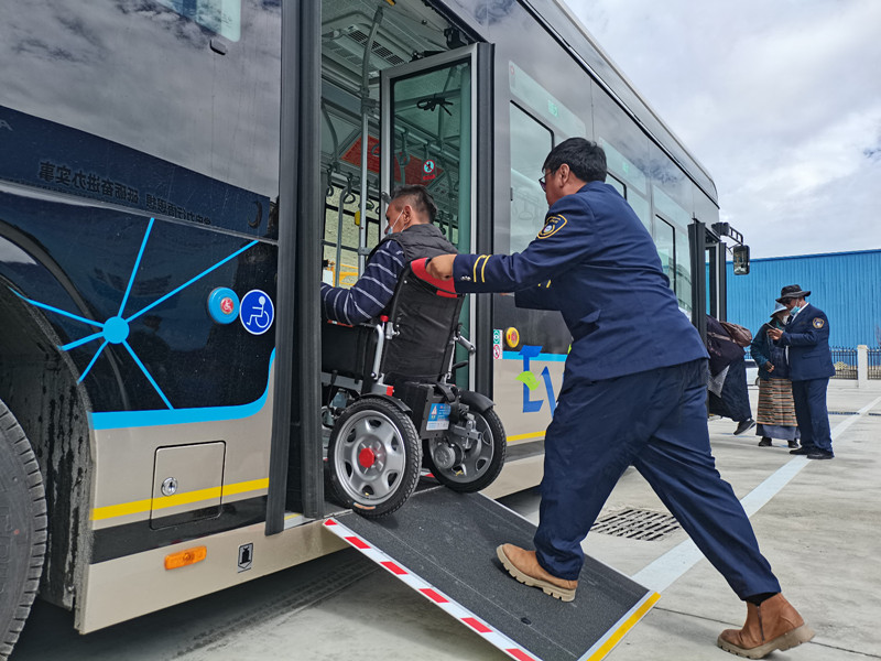 3日,拉薩市公交運(yùn)營有限公司舉行拉薩公交經(jīng)開區(qū)B區(qū)公交首末站啟用暨大站快線開通儀式。現(xiàn)場,坐在輪椅上的市民覺列準(zhǔn)備乘坐新公交車,駕駛員接到乘車提示后,采取制動(dòng)措施,將車輛熄火后來到后門處,將無障礙踏板翻開并固定好,順利幫其上車。