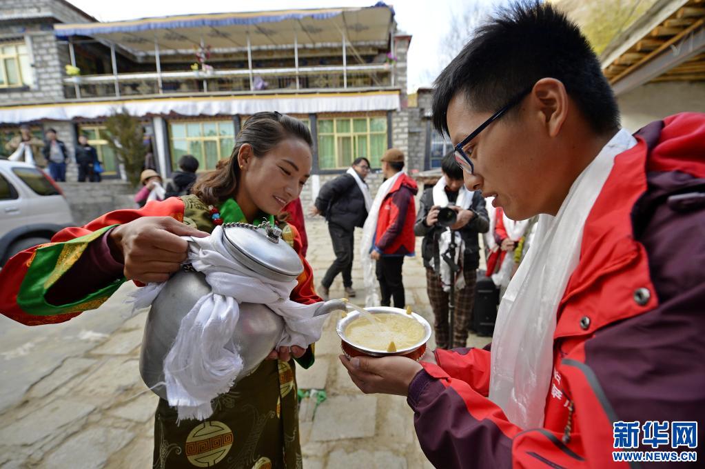2016年11月15日,在拉薩市奪底鄉(xiāng)維巴村,一名民宿負(fù)責(zé)人為剛抵達的游客斟滿青稞酒。 劉東君 攝