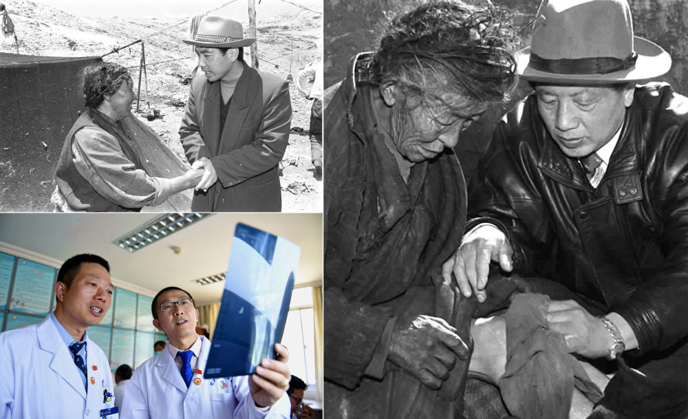 左上圖為來自陜西的援藏干部、阿里日土縣副縣長賈冗勇深入牧區(qū),幫助藏族牧民解決生產(chǎn)、生活的實際困難(新華社記者土登攝,1997年11月11日發(fā));左下圖為2017年8月3日,北京積水潭醫(yī)院援藏醫(yī)生龔曉峰(右)和北京天壇醫(yī)院援藏醫(yī)生李家謀在拉薩市人民醫(yī)院骨科病房內(nèi)查看患者的X光片,進(jìn)行工作交接(新華社記者晉美多吉攝);右圖為孔繁森(右)在阿里日土縣過巴鄉(xiāng)為孤寡老人益西卓瑪治?。ㄐ氯A社記者土登攝,1994年12月26日發(fā))。