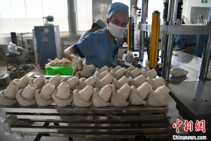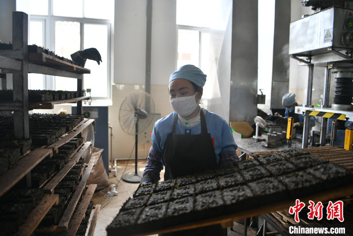 圖為8月12日,工人正在生產(chǎn)邊銷(xiāo)磚茶。中新社記者 劉冉陽(yáng) 攝