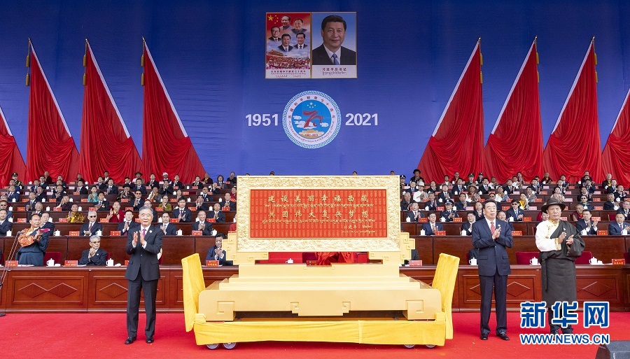 8月19日,慶祝西藏和平解放70周年大會(huì)在拉薩隆重舉行。中共中央政治局常委、全國(guó)政協(xié)主席、中央代表團(tuán)團(tuán)長(zhǎng)汪洋向西藏自治區(qū)、西藏軍區(qū)、武警西藏總隊(duì)、西藏自治區(qū)政法系統(tǒng)、中國(guó)佛協(xié)西藏分會(huì)分別贈(zèng)送了中共中央總書(shū)記、國(guó)家主席、中央軍委主席習(xí)近平題詞的“建設(shè)美麗幸福西藏 共圓偉大復(fù)興夢(mèng)想”賀匾和賀幛。新華社記者 黃敬文 攝