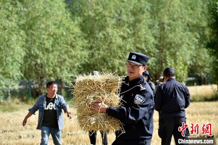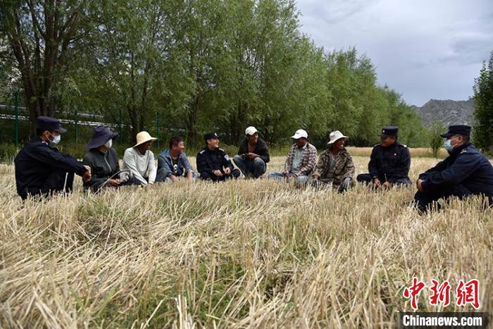 一陣忙碌過后,大家圍攏在田里聊變化說發(fā)展。慶祝西藏和平解放70周年大會剛剛舉行,大家聊著現(xiàn)場觀禮、收聽收看的感受。參加現(xiàn)場大會的民警高揚(yáng)向大家分享現(xiàn)場感受,講述自己在西藏生活學(xué)習(xí)工作22年的發(fā)展變化和入警初心。歡聲笑語過后,大家又忙碌起來。田間地頭藏青藍(lán)的身影,與金黃麥地構(gòu)成一幅加強(qiáng)民族團(tuán)結(jié)、警民魚水情深的動人畫卷。