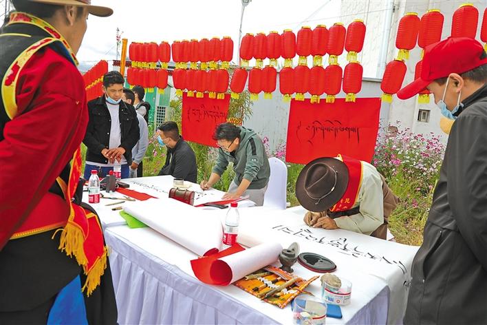 尼木縣書法愛(ài)好者揮毫潑墨寄托祝福。格桑倫珠 黃志武 攝