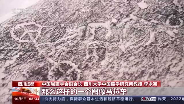 中國(guó)巖畫學(xué)會(huì)副會(huì)長(zhǎng)、四川大學(xué)中國(guó)藏學(xué)研究所教授 李永憲:那么這樣的一個(gè)圖像馬拉車,騎馬的人、牦牛、三只鹿、公鹿,所有的動(dòng)物、人物、車輛,它們都是朝一個(gè)方向行進(jìn)。