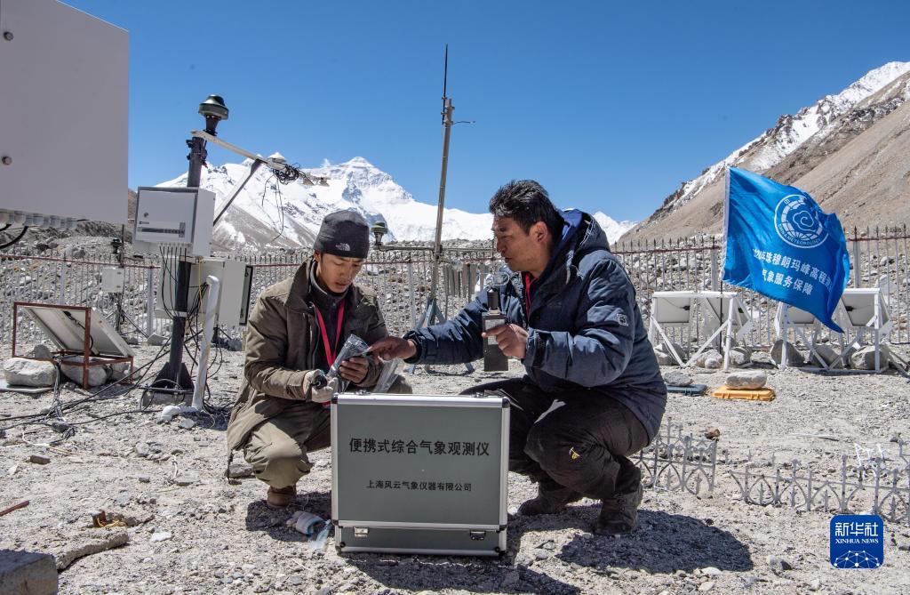 西藏自治區(qū)氣象局工作人員在珠峰大本營自動(dòng)氣象站組裝便攜式綜合氣象觀測儀,為2020珠峰高程測量活動(dòng)提供氣象保障(2020年5月10日攝)。新華社記者 普布扎西 攝