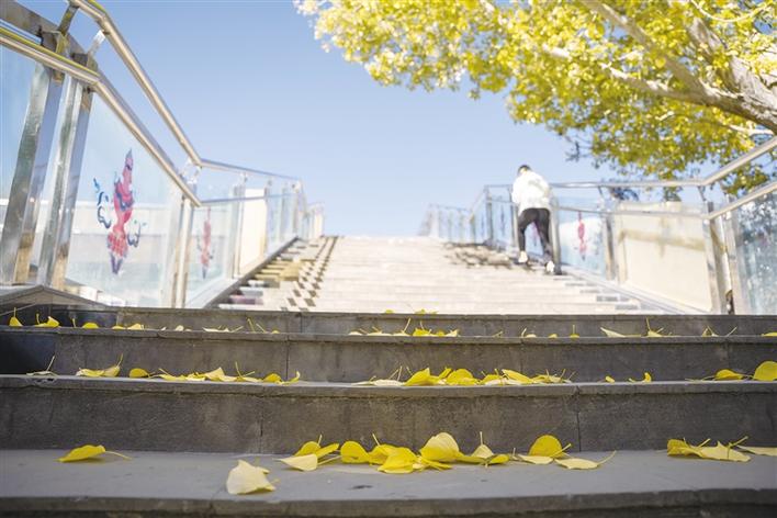 陽光溫暖地包裹著大地,穿過草木,穿過人群,在地上折射出好看的光影。樹木一排排整齊站立著,樹葉時不時隨風(fēng)飄落,落在地面,鋪作一地金色的地毯,行人走過,發(fā)出“沙沙”的聲響,伴著人們的說笑聲,格外動聽美妙。