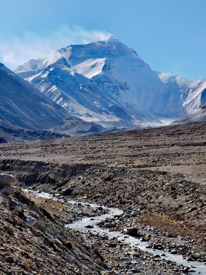 車行約20分鐘后,到達(dá)游客大本營(yíng)。這里是游客在珠穆朗瑪峰國(guó)家級(jí)自然保護(hù)區(qū)內(nèi)可以到達(dá)的距離珠峰最近的位置。面向海拔8848.86米的珠峰,發(fā)源于絨布冰川末端的扎嘎曲在游客大本營(yíng)右邊流過。