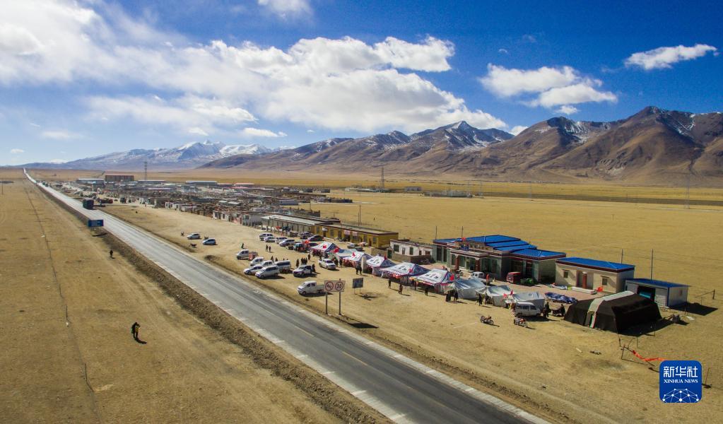 這是在青藏公路旁搭建的那曲縣香茂鄉(xiāng)畜產(chǎn)品展銷會(2017年11月25日攝,無人機照片)。新華社記者 劉東君 攝