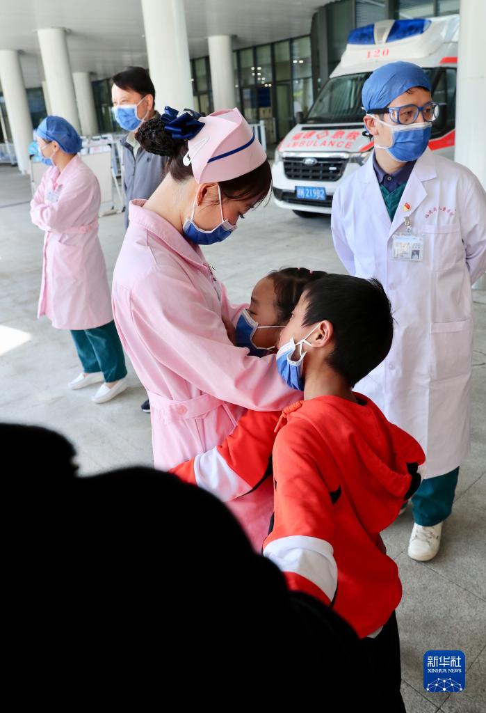 12月1日,在福建省兒童醫(yī)院,康復出院的先心病患兒在上車前與照顧自己多日的醫(yī)務人員告別。新華社記者 姜克紅 攝