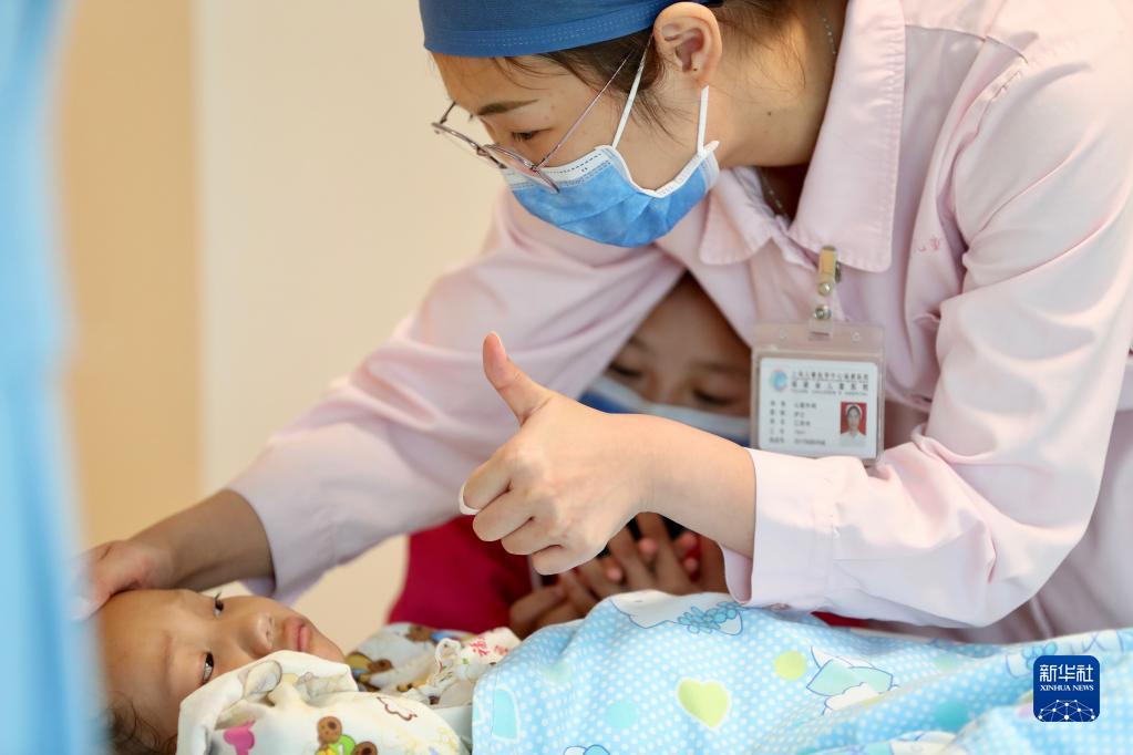 11月25日,在福建省兒童醫(yī)院病房,護士向康復中的先心病患兒索朗次珍表示鼓勵。新華社記者 姜克紅 攝