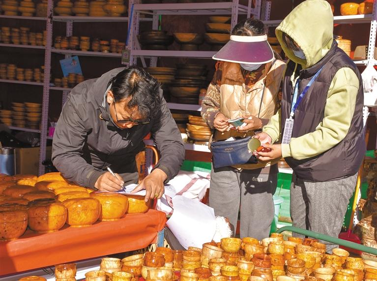 山南本地的特色優(yōu)質(zhì)商品尤其受到青睞:扎囊的氆氌,洛扎的粉絲,瓊結(jié)的蕎麥面,加查的核桃、木碗,貢嘎的邦典、紅土豆,措美的奶渣、牛羊肉等等,紛紛占據(jù)重要展位,引來消費者紛至沓來,熱情選購。