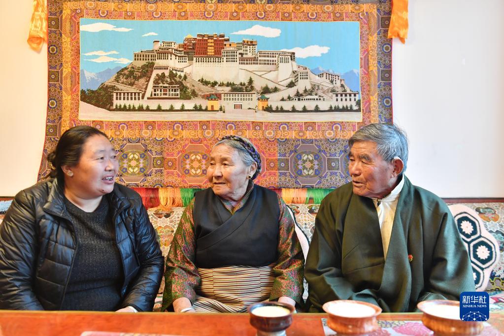 土丹堅(jiān)參老人(右)和老伴(中)、女兒在一起聊天(5月11日攝)。新華社記者 孫瑞博 攝