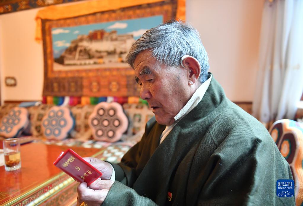 土丹堅(jiān)參老人在翻看自己的黨費(fèi)證(5月11日攝)。新華社記者 孫瑞博 攝