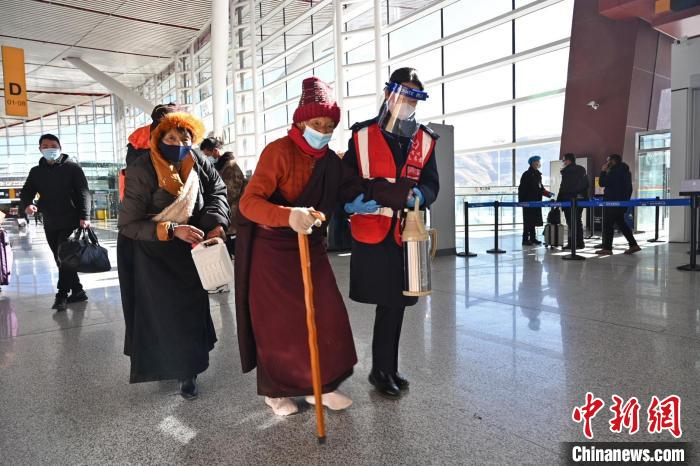圖為在拉薩貢嘎機(jī)場(chǎng),多個(gè)臨時(shí)點(diǎn)位安排了志愿者為旅客提供服務(wù)。貢嘎來松 攝