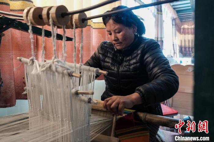 在他們家,記者看到了幾臺(tái)傳統(tǒng)藏式織機(jī),玉珍說(shuō),這是用于織邦典(藏式毛織圍裙)的工具。2016年開始,玉珍運(yùn)用編織技藝帶領(lǐng)村里的婦女共同成立了一個(gè)小規(guī)模的編織廠,“我們的羊毛線是自己染的,織出來(lái)的邦典質(zhì)感更好,也不愁銷路,為家里增收不少?!彼f(shuō),編織讓大家實(shí)現(xiàn)了家門口就業(yè),也不耽誤家務(wù),村里人很樂(lè)于接受。