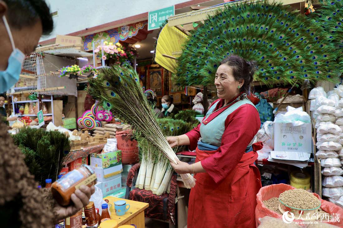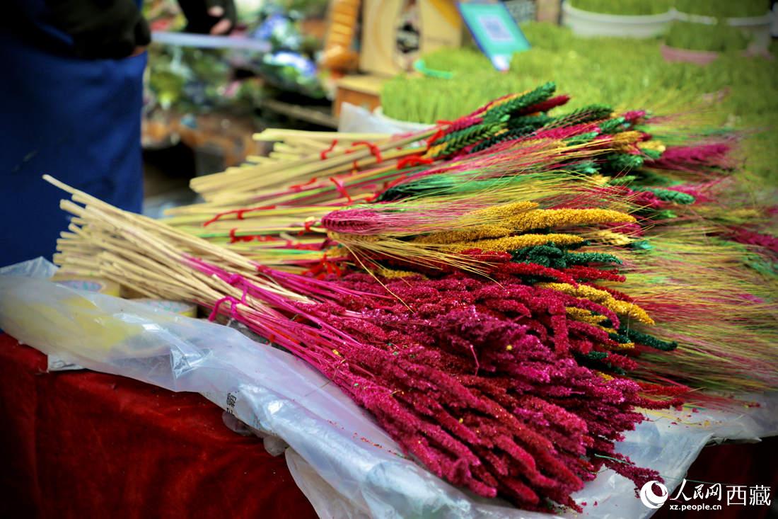 八廓商城一角售賣(mài)的 “羅薩美朵”。(每年的藏歷新年,家家戶(hù)戶(hù)的切瑪盒里都要插上 “羅薩美朵”,代表著溫馨的家庭里有著幸福的祝愿,承載著歡樂(lè)的故土上,能夠五谷豐登的期盼。)人民網(wǎng) 次仁羅布攝