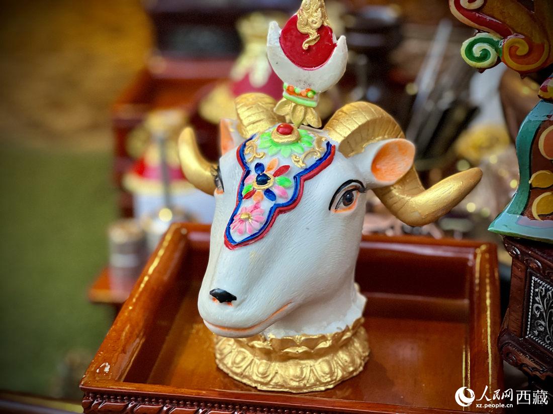 年貨市場(chǎng)上售賣(mài)的“隆果”。(在藏語(yǔ)中,“隆果” 是羊頭的意思,也是新年的諧音。它一般擺放在所有供品的中央,因?yàn)槿藗冋J(rèn)為“羊”是吉祥之物,同時(shí)也祈盼五谷豐登,六畜興旺。)人民網(wǎng) 次仁羅布攝