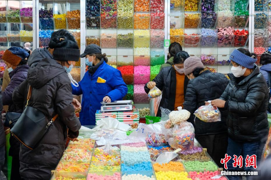 目前正值藏歷12月下旬,西藏即將迎來傳統(tǒng)藏歷水虎新年,拉薩民眾也全面進入“藏歷新年時間”。2月27日下午,小新在西藏最大的傳統(tǒng)綜合市場——拉薩沖賽康市場周邊看到,羅薩美朵、卡塞、酥油、切瑪盒、糖果、干果、藏式服裝等年貨琳瑯滿目,購買的市民也進入“最后”的采購時間,市場周圍人群絡(luò)繹不絕,高原迎春、年味十足。圖為一商販在拉薩沖賽康市場周邊銷售藏歷新年年貨“褪”。江飛波 攝