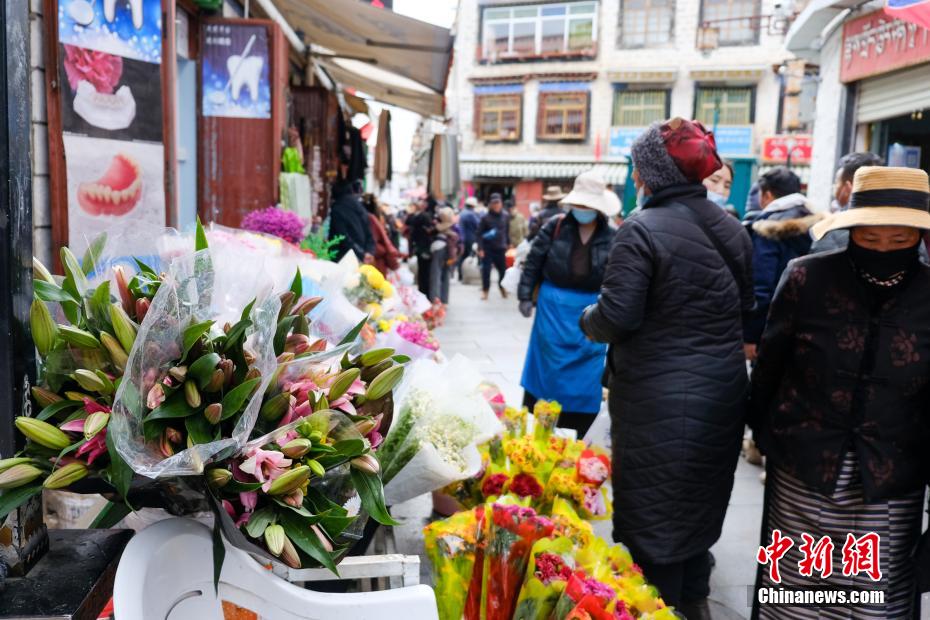 圖為拉薩沖賽康市場附近,銷售鮮花的攤販。江飛波 攝