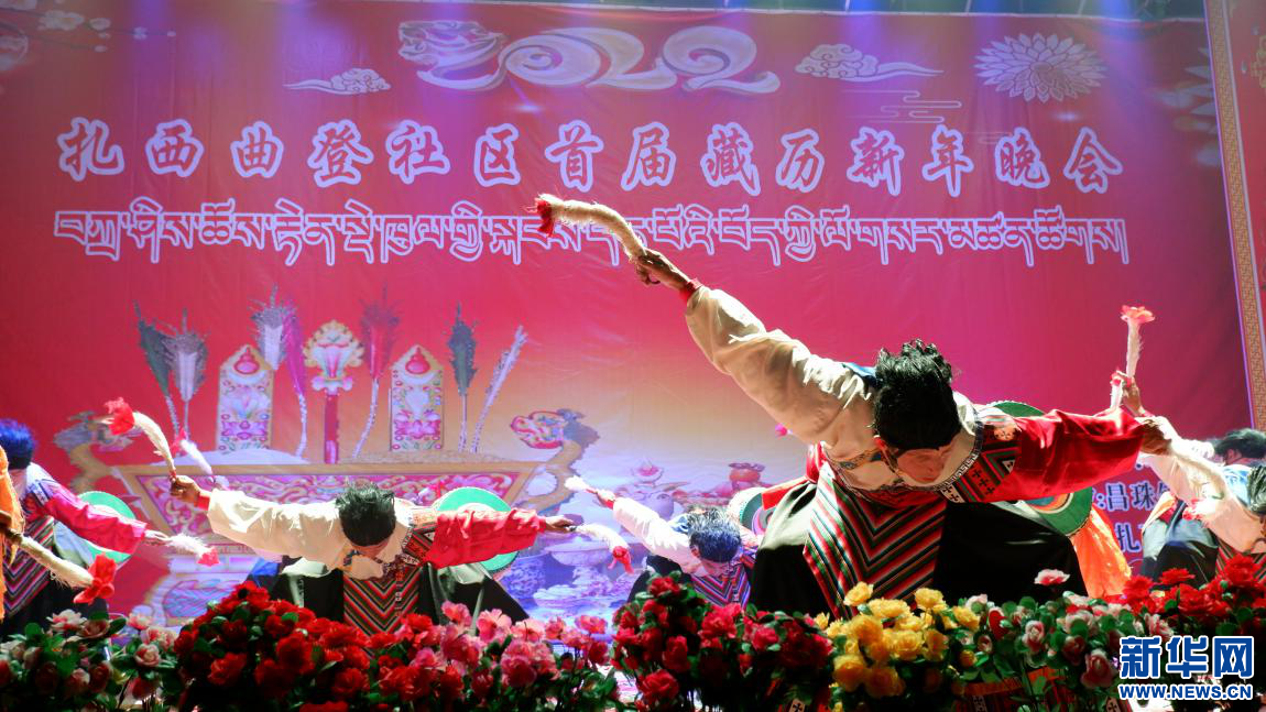 扎西曲登社區(qū)首屆藏歷新年晚會(huì)上的傳統(tǒng)舞蹈節(jié)目《雅礱卓舞》(2月26日攝)。新華網(wǎng) 殷小燕攝