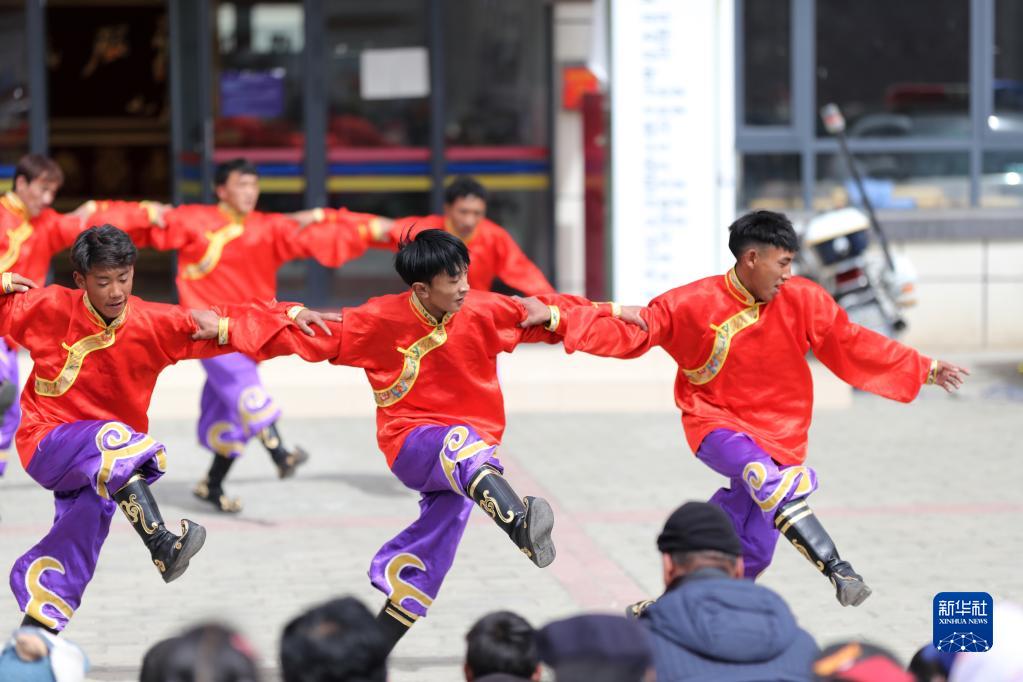 搬遷牧民在搬遷點(diǎn)廣場(chǎng)上跳起民族舞蹈,迎接藏歷新年(2月28日攝)。新華社記者 覺(jué)果 攝