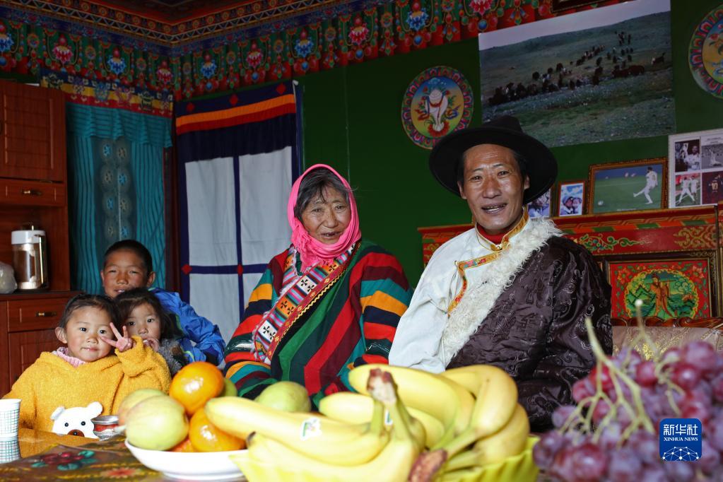 搬遷牧民仁增(右一)一家為藏歷新年購(gòu)買(mǎi)了很多新鮮水果,他的小女兒古榮卓瑪(左一)是搬遷點(diǎn)第一個(gè)出生的孩子(2月28日攝)。新華社記者 姜帆 攝