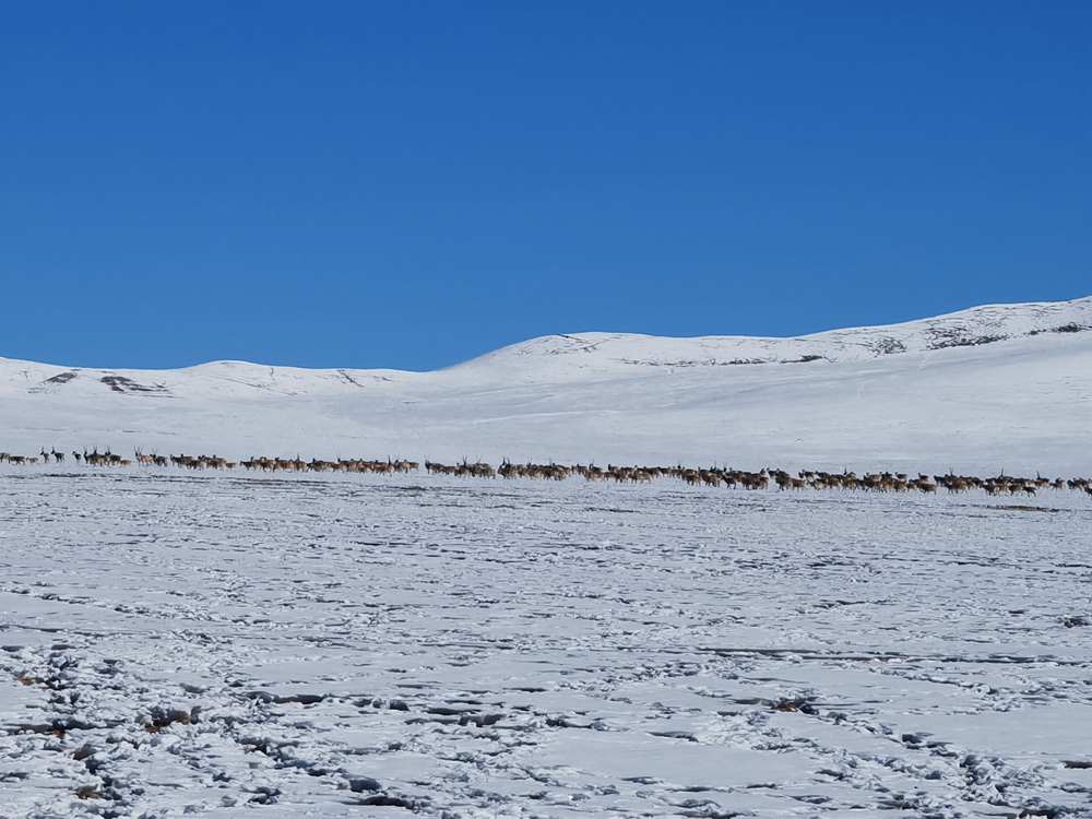 之后幾天,仁增羅布多次打電話向管護(hù)員詢問(wèn)情況,最終漸漸弄明白了情況——原來(lái),因?yàn)檫@些天的大雪,這些藏羚羊聚集到這片積雪較淺的草場(chǎng)上,就為了在這大雪天有一口食物。