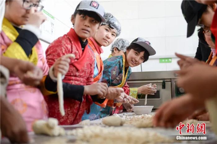2017年2月25日,幾名藏族學生在制作“古突”。當日,安徽省合肥市第三十五中學西藏班的藏族學生通過制作“古突”、表演文藝節(jié)目等方式,迎接藏歷火雞新年的到來。中新社記者 張婭子 攝