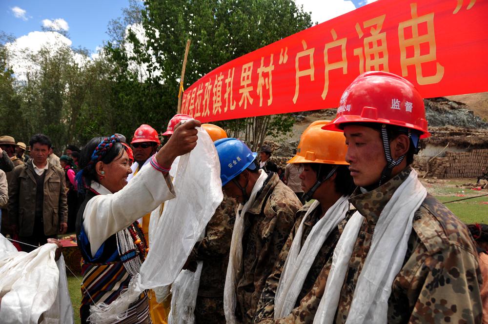 西藏日喀則市江孜縣扎果村戶戶通電工程竣工投運,農(nóng)牧民群眾向工程建設(shè)者們獻上哈達。圖片由國網(wǎng)西藏電力提供