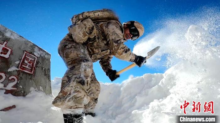 圖為巡邏官兵清理界碑積雪。西藏軍區(qū)供圖