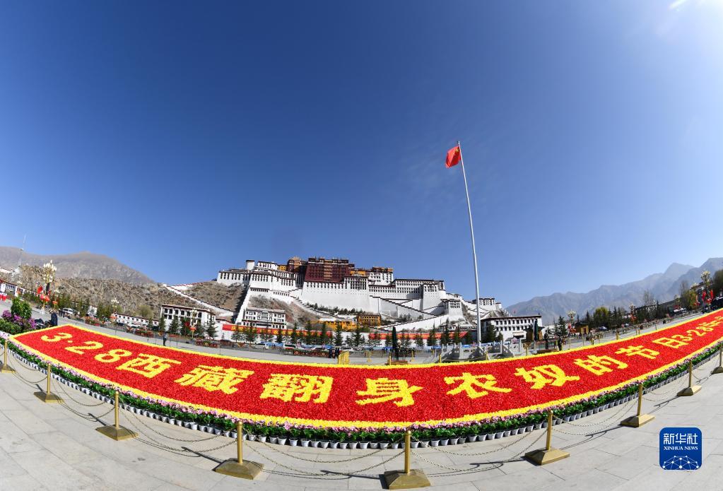 63年后的今天,春風(fēng)和煦,陽光明媚。上午9時40分,在《翻身農(nóng)奴把歌唱》的伴奏下,西藏各族各界群眾代表聚集在拉薩布達拉宮廣場。蔚藍的天空下,和平鴿展翅翱翔。