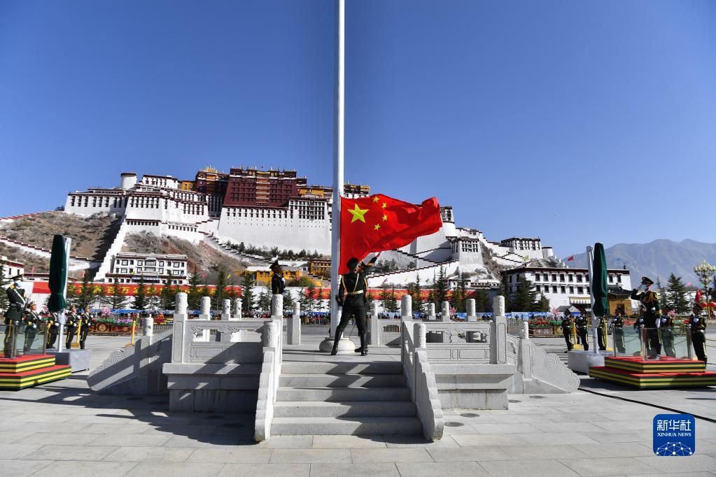 上午10時,隨著《義勇軍進行曲》的響起,五星紅旗在布達拉宮廣場迎風(fēng)飄揚。大家肅穆而立,向著國旗行注目禮。