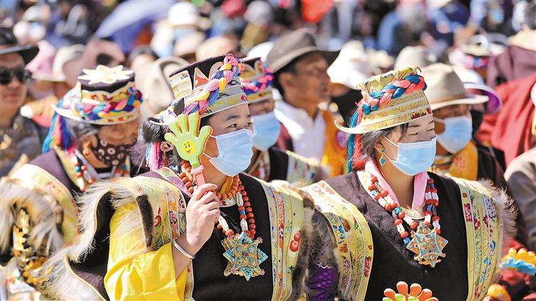 圖為在第七屆“尼屋桃花節(jié)”開幕式上,身穿民族服裝的當?shù)厝罕姟?記者 萬靖 通訊員 平措卓瑪 攝