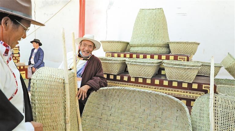 圖為尼屋鄉(xiāng)農(nóng)牧民曲加在第七屆“尼屋桃花節(jié)”特色產(chǎn)品展銷區(qū)域售賣自己手工編織的竹筐。記者 萬靖 通訊員 索朗 攝