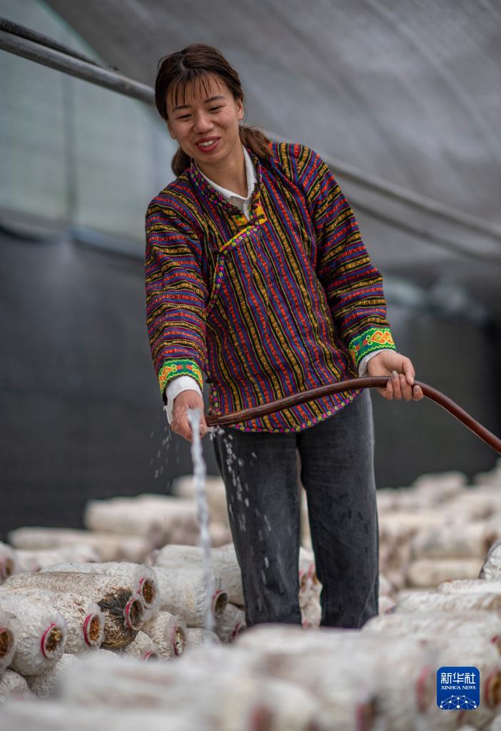 4月14日,次仁拉珍在給菌棒澆水。新華社記者 格桑邊覺 攝