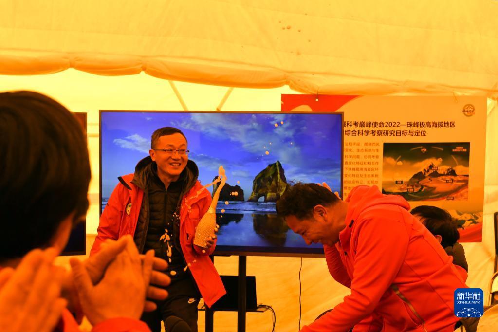 在珠峰腳下海拔5200米的總指揮會議室?guī)づ窭?,大家熱烈慶?!皫p峰使命”珠峰科考登頂觀測采樣成功(5月4日攝)。新華社記者 姜帆 攝