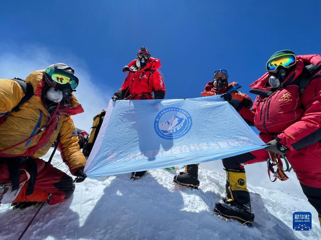 5月4日,在珠穆朗瑪峰頂,科考隊員正在展示第二次青藏高原綜合科學考察研究旗幟。新華社特約記者 索朗多吉 攝