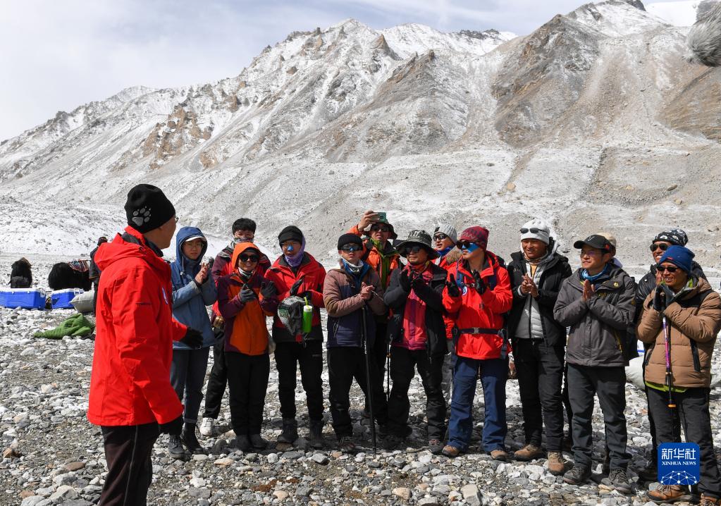 在珠峰登山大本營,冰川與污染物科考小組負(fù)責(zé)人康世昌(左一)在做行前動(dòng)員(5月1日攝)。新華社記者 姜帆 攝