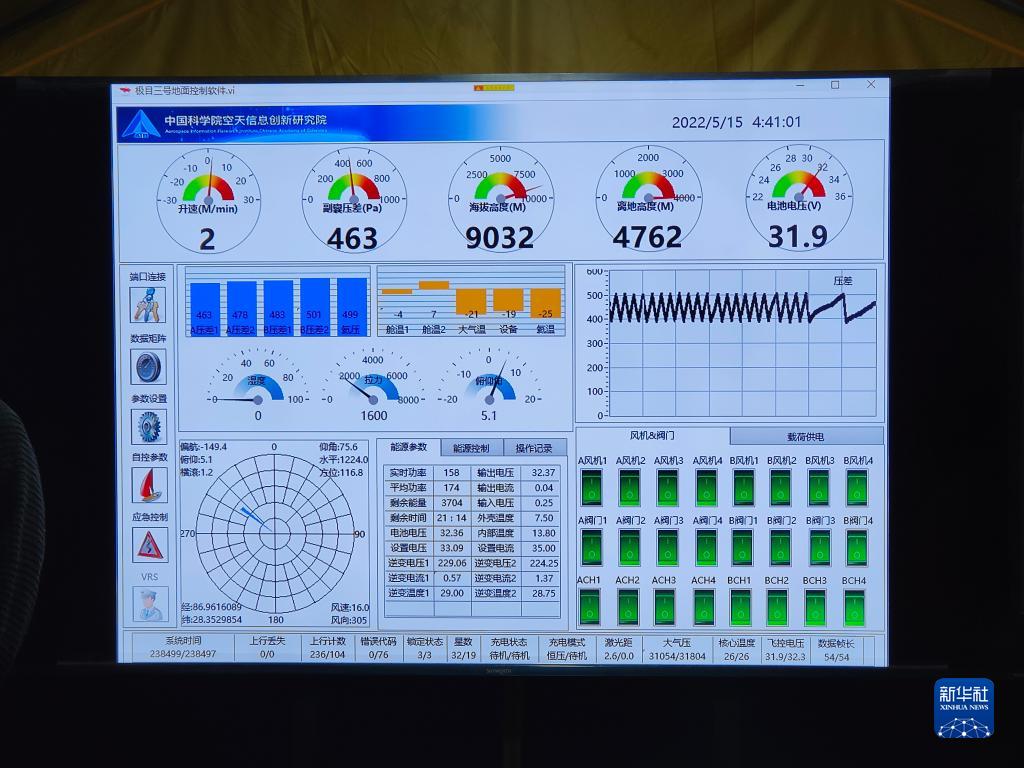 中國(guó)科學(xué)院空天信息創(chuàng)新研究院“極目一號(hào)”Ⅲ型浮空艇地面控制軟件顯示,浮空艇達(dá)到海拔9032米(5月15日 攝)。新華社記者 田金文 攝