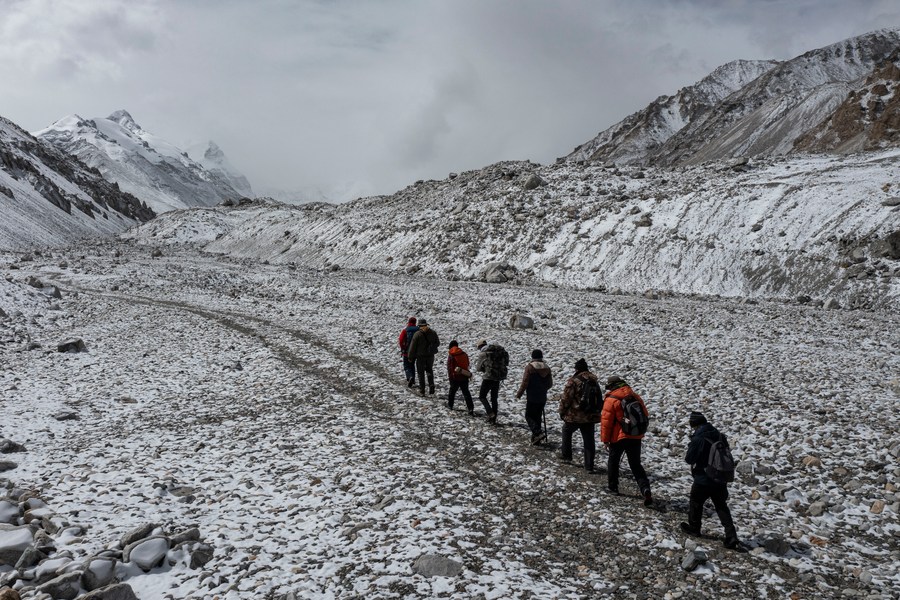 冰川與污染物小組在東絨布冰川行進(jìn)(5月6日攝,手機(jī)照片)。新華社發(fā)(受訪者供圖)