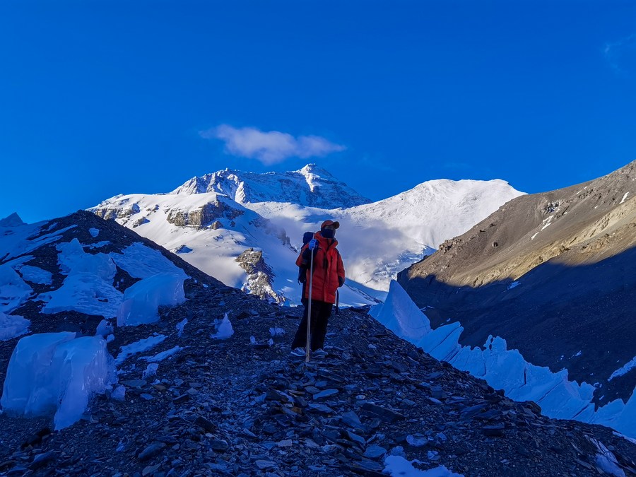 冰川與污染物小組在東絨布冰川觀察測(cè)量(5月5日攝,手機(jī)照片)。新華社發(fā)(受訪者供圖)