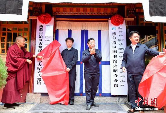 5月26日,西藏自治區(qū)圖書館大昭寺分館和自治區(qū)古籍保護(hù)中心大昭寺古籍館正式揭牌。這是繼拉薩哲蚌寺之后,又一座寺廟建立分館。圖為揭牌儀式現(xiàn)場。 中新社記者 貢嘎來松 攝