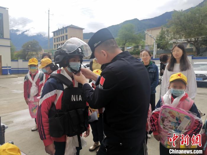 圖為民警為小學生穿戴警用裝備。派邊境派出所供圖