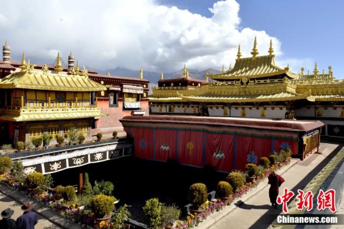 2014年10月拍攝的大昭寺金頂。大昭寺是西藏重大佛事活動的中心,“噶廈”政府的機(jī)構(gòu)設(shè)于寺內(nèi)。許多重大的政治、宗教活動,如“金瓶掣簽”等都在這里進(jìn)行。中新社記者 李林 攝