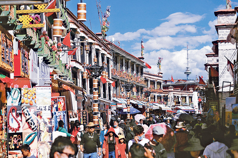 位于拉薩老城區(qū)的八廓街,是西藏著名的商業(yè)街。近年來,越來越多不同民族的人們從五湖四海來到這里創(chuàng)業(yè)、旅游。圖為眾多游客在八廓街觀光游覽。 中新社記者 富田/攝