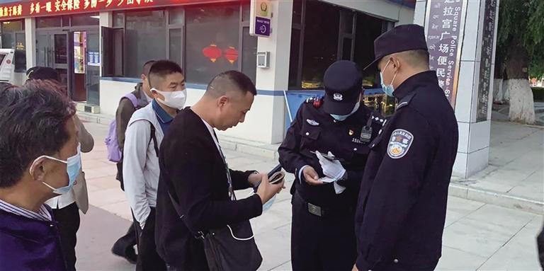 民警使用5G移動警務(wù)終端對過往人員進(jìn)行檢查。圖由布達(dá)拉宮便民警務(wù)站提供