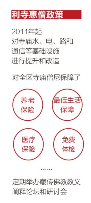 西藏出臺(tái)了一系列利寺惠僧政策,對(duì)全區(qū)寺廟僧尼保障了養(yǎng)老保險(xiǎn)、最低生活保障、醫(yī)療保險(xiǎn)、重大疾病醫(yī)療保險(xiǎn)、免費(fèi)體檢等。同時(shí)定期舉辦藏傳佛教教義闡釋論壇和研討會(huì),鼓勵(lì)藏傳佛教界代表人士對(duì)藏傳佛教經(jīng)典教義作出符合國(guó)家法律法規(guī)、社會(huì)主義核心價(jià)值觀和中華優(yōu)秀傳統(tǒng)文化精神的新闡釋,藏傳佛教中國(guó)化邁出了新步伐。