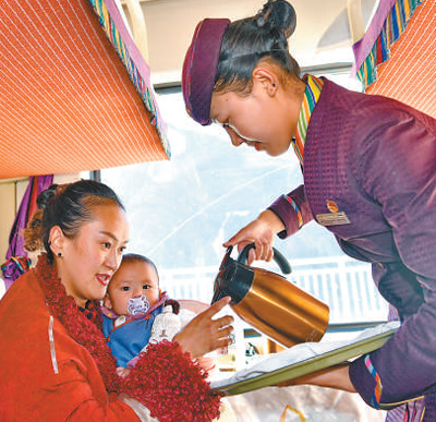 青藏鐵路延長線拉日鐵路Z8801次列車上,乘務員在為乘客倒水。新華社記者 張汝鋒攝
